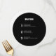 This contemporary wedding menu design features the courses of your wedding meal in simple fonts and a sleek and clean design. This solid black circle menu card certainly stands out from the crowd. Modern typography and menu design for a modern wedding. All elements are customisable - text, background and colours. Edit the names and dates on the back -or simply delete if you want to use this round menu card for an event that is not a wedding.