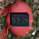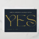 Elegant and sophisticated: A modern gold foil save the date wedding invitation with strong elegant typography for Yes and your names and wedding information on the front. Customise the message on the back of the card - this super versatile design is also fitting for a wedding announcement.