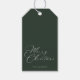 These modern ultra-minimalist fir green Christmas and holiday gift tags are contemporary, customisable and stunning. This design features handwritten cursive typography stating 'Merry Christmas' with a personalised family name component.