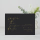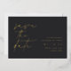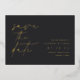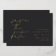 Simple and elegant wedding save the dates for modern minimalist couples feature "save the date" in gold foil handwritten script lettering aligned at the left. Your wedding details appear in classic lettering at the right against a rich charcoal black background. Use the back for sharing additional information with your guests.
