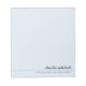 Light dusty blue or custom colour notepad with a thin border between your name and custom text. The text is aligned to the right. Fonts and colours can be customised with the design tool.
