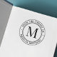 From the library of or this book belongs to rubber stamp with your monogram initial in the center and custom text and name in a modern sans-serif font. An elegant and minimal bookplate design.