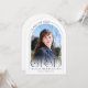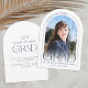This navy blue and white simple minimalist graduation announcement features a photo, arch frame and elegant modern typography.