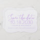 Simple, Minimal, Plain Non-Photo Save the Date Card in an elegant fancy die-cut bracket shape in lilac lavender orchid purple and white with elegant script typography and large date numbers in a chic sans-serif font. Customise the template by selecting any colours and fonts you want for your wedding announcements.
