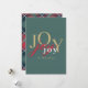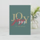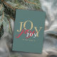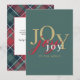 With elegant minimalist styling and modern mixed colour typography, this festive holiday card shares the joy of the Christmas season. It features the word joy multiplied 3 times in different colours; gold, red and white on a refreshing spruce green background. The back of the card has a template to personalise with your holiday message and name(s) and a rustic tartan plaid background in coordinating colours.
