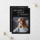 Modern high tech style 2 Photo graduation announcement cards, featuring design elements of sophisticated text reading "Grad" and the graduation year along with a space for your school name, and of course your name. One photo on the front of the card with a second photo on the back. The back of the card also offers personalised text spaces for information about your graduation and future journey. Colours are white and transparent grey coloured text on black or easily change the background colour as you like. Perfect for the high school, college and university grad student seniors.