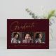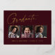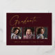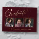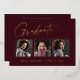 Clean, trendy, modern and elegant "3 Photo" graduation announcement gold foil cards (your choice of gold silver or rose foil), featuring design elements of modern text with a unique calligraphy ink script. The graduate's photos are accented with a delicate & minimalist partial boarder. The back of the card offers personalised text spaces for information about your graduation or can be cleared if you wish to hand write a message. Burgundy red with gold foil or easily customise the background to match your school's primary colour or any colour of your choice. Perfect for the high school, college and university grad student senior.