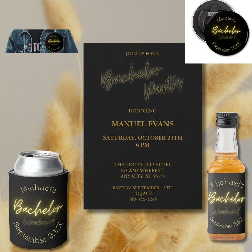 Invite your friends and family to a stylish bachelor party with this modern minimalist invitation in black and gold. Cheers to a fun bachelor night. Coordinating items available upon request.