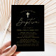 The simple baptism invitations feature a casual gold foil calligraphy script with a black background for a design that is perfect for modern baby baptisms. Personalise the elegant baptism invitations with your child's name and religious event details below. The back of the black and gold foil baptism invitation provides space for additional text and photos.