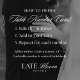 Elegant wedding table number card displaying the word "Table" in a black handwritten script with the table number, your names, and wedding date shown below with a white background. The design repeats on the back. To order the table number cards, simply type each number and add it to your cart.