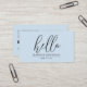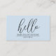 This business card features a simple minimalist script type hello in black typography on a white background. Add your contact information, social media info, and QR code. A simple business card that serves as a friendly introduction.