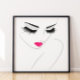 This poster showcases a minimalist face illustration with striking black eyelashes and sleek, angular eyebrows. The lips are a vibrant pink with a glossy look. The color scheme is simple, using black, white, and pink.