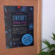 A subtle line art floral print on an birthday invitation. Use "Personalise this template" to add your event details. Featuring modern geometric versions of flowers including Japanese anemones, daffodils, violets, pansies, daisies, roses, Michaelmas daisies, cinquefoils, primroses, buddleia, clematis, gardenia, phlox and forget-me-nots. The print is light blue lines over purple lines on a dark blue background.