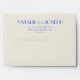 A retro modern hand written bright colourful wedding envelope. Which features bold bride and groom's names in blue french colour. And personalised return address . On simple beige creamy colour background. Which suits the whole wedding suite.