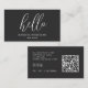 This business card features a simple minimalist script type hello in white typography on a black background. Add your contact information, social media info, and QR code. A simple business card that serves as a friendly introduction.