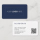 Create your own professional business card with this simple and stylish design. A double-sided template personalised with your logo, name, address, contact information, and a scannable QR code. All the text can be customised or deleted, so you can include the information you want. Printed colours: deep navy blue, black and white. Choose from a range of paper textures and weights.