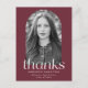 Modern graduation thank you postcard featuring the graduate's photo framed by a maroon arch-shaped frame. "Thanks" is displayed in white modern italicized lettering. Personalize the front of the trendy graduation thank you postcard by adding the graduate's name, school name, and graduation year. The postcard reverses to display your return address and custom message.