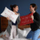 Personalised "Merry and Married" typography lumbar pillow. Front has a white background, back has a dark red background.