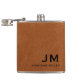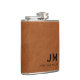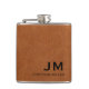Simple monogrammed flask features large typography initials in classic block typography with your name below on a sable brown distressed leather look textured background. Perfect for birthdays, graduation, retirement, wedding groomsmen gifts and more.