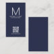 Modern minimalist design features monogram and name with business details in white modern sans serif font style with QR Code on navy blue background.