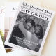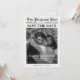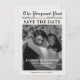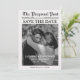 Minimalist calligraphy newspaper wedding save the date with three photos, one of the groom and bride as children and one of them as adults.