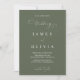 The rich, deep olive green provides a stunning backdrop for your wedding details, featuring refined minimalist typography and subtle script accents for 'The Wedding of'. On the reverse, a dedicated space allows you to showcase your cherished engagement or favourite couple's photo, adding a truly personal touch that tells your unique love story.