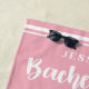 Pink and white preppy modern Bachelorette Weekend Beach Towel with the bride's name in a customisable template and bold calligraphy typography Bachelorette graphic. You can add more text ( event date, bridal party member names, etc. ) or change the pink to another colour using the Design Tool.