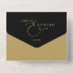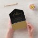 This all-in-one minimalist wedding invitation features elegant gold typography on a black background. The invitation includes a perforated RSVP card with your wedding website QR code. Designed by Thisisnotme©
