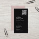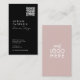 Elegant, modern business card with your Logo and QR code prominently displayed on muted pastel colours alongside your contact information, including social media handle in a stylish script and timeless typography design. This is the blush and black version.