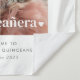 A simple Quinceañera tapestry welcome sign featuring your own photo in an arch shape and the word 'Quinceañera' over the top with a little heart. Perfect for welcoming guests to celebrate your daughters special day!