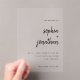 These elegant, minimalist clear acrylic wedding invitations feature black, modern script typography and clean, sans serif text for a simple and stylish design you will love.