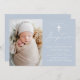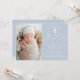 The simple baptism invitations feature a casual white calligraphy script with a dusty blue background for a design that is perfect for a modern baby baptism. Personalise the elegant baptism invitations with your child's photo, name, and religious event details below. The back of the dusty blue photo baptism invitation provides space for additional text and photos.