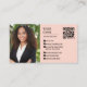 Turn to the back, where functionality meets style. A personalizable photo provides a glimpse into your personality or brand identity, while your business information and contact details are crisply displayed in classic black and blush pink. Seamlessly integrated, a QR code offers convenient access to your online presence, ensuring potential connections can effortlessly engage with your business.