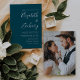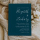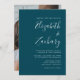 This simple modern wedding invitation features white text on a teal blue background. Add the names of the bride and groom in stylish handwriting calligraphy and the details in sans serif font. Easily replace the sample image on the reverse side with your own photo.