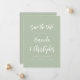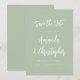 This simple modern wedding save the date card features white text in stylish handwriting calligraphy and sans serif font on a sage green background. The back of the card is solid sage green.