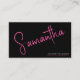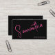 This modern minimalist black business card features your first name written in an elegant pink script on the front along with your company name or title in the bottom corner. The back features your full name, title or company name with a thin pink divider line between your title and contact information. This simple modern design with pink and white text on a black background creates a professional modern minimalist look for your business. Personalise this template with ease by simply adding your name, company or title and contact information to create your own trendy professional business card.