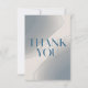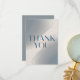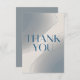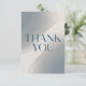 a minimalist design with the words "Thank you" written in a bold, sans-serif font against a neutral background of soft blue and grey tones. The text is arranged in a simple, centred layout, with the "Thank" positioned above the "you" in a slightly offset manner. The background features abstract, flowing curves in shades of blue and grey, creating a sense of movement and depth.