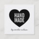 Modern minimalist business card with the word "Handmade" in bold font in white against a black heart and a stylish script for your name or store name in black. This stylish square handmade business card is ideal for crafters and makers of handmade goods like artists, knitters, dressmakers, etc. It also works well as a gift tag, favour tag or product tag for your handmade goods.