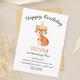 A cute whimsical woodland fox Neutral gender first birthday invitation featuring your child's name and age.
