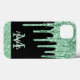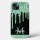 Elegant, modern, girly mint green glitter drips custom personalised name and monogrammed iphone case. This design features faux light pastel mint green colour glitter sparkle drips on black background with custom personalised monogram initial and first name text template. Perfect feminine gift for girl and women who loves pretty trendy glam things. If you need help or matching items, please contact to me.