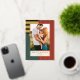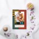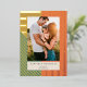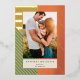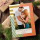 This festive yet modern holiday photo card features a mix of thick / thin stripes in gold foil with a warm red, ochre yellow, and dark green colour palette. There is a single vertical photo and modern typography. The stripe pattern is continued on the reverse side. DESIGN TIP: You can further customise this design by adding another photo and/or additional text to the back of the card.
