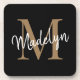 Modern Monogram Black Gold Feminine Script Name Beverage Coaster. Easily personalize this modern elegant beverage coaster with your custom monogram and name.
