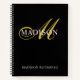 An elegant monogrammed notebook with gold script with unique bold flourish, and white serif name on a rich black background. Modern trendy style.