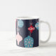 Modern and stylish personalised Christmas mug with dangling tree ornaments pattern on navy blue background.