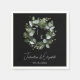 This napkin design features a simple eucalyptus wreath with elegant script and typography in black. Perfect for the couple who want a modern and minimalist botanical design for their wedding. Personalise with the groom and bride names, monograms, and wedding date for a napkin all your own.