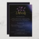 A few branches of eucalyptus leaves, hand-drawn in colour pencil and layered with shades of dusty and dark purple, make for a modern, sophisticated, elegant yet chic wedding enclosure card. The black and dark blue background with hints of purple and lights illuminate the midnight sky. The elegant calligraphy script, in the hue of gold, makes this stylish black and purple design even more elegant.