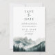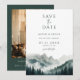 Announce your upcoming nuptials with the Verdant Peaks | Watercolor Save the Date. This card features a stunning, atmospheric landscape of misty evergreen forests and towering mountain peaks rendered in deep, moody watercolors.