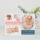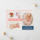Modern, Girly Light Coral and Navy Baby Birth Announcement 4 Photo Collage Cards. Elegant, cute 2-sided photo birth announcement template card featuring four (4) of your favourite baby photos on front, with a pretty hand lettered script in white on pastel light coral red and navy blue colour blocks. Add your baby's name on the front and birth stats. On the back side there's one horizontal baby photo on blush pink white dotted background. You can easily personalise it.