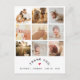 Send your custom thank you message to your family and friends while showcasing some of your favourite moments from this year! This modern minimalist multi-photo collage postcard features a collage of nine square photos. Below, in modern minimslist font is written ´thank you´ in arch and your baby´s name & date of birth with a tiny boho red heart above. These cards reverse to a custom message. Click on "Personalise this template" to edit the text and upload your own photos. This card will be a favourite keepsake for years to come! Perfect as a baby shower thank you card and to introduce your newborn!