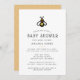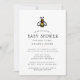 Modern line art bee in black and orange with green heart in the middle baby shower invitation. Modern typography used. On the back of the card is dust yellow with ghost honeycomb pattern.